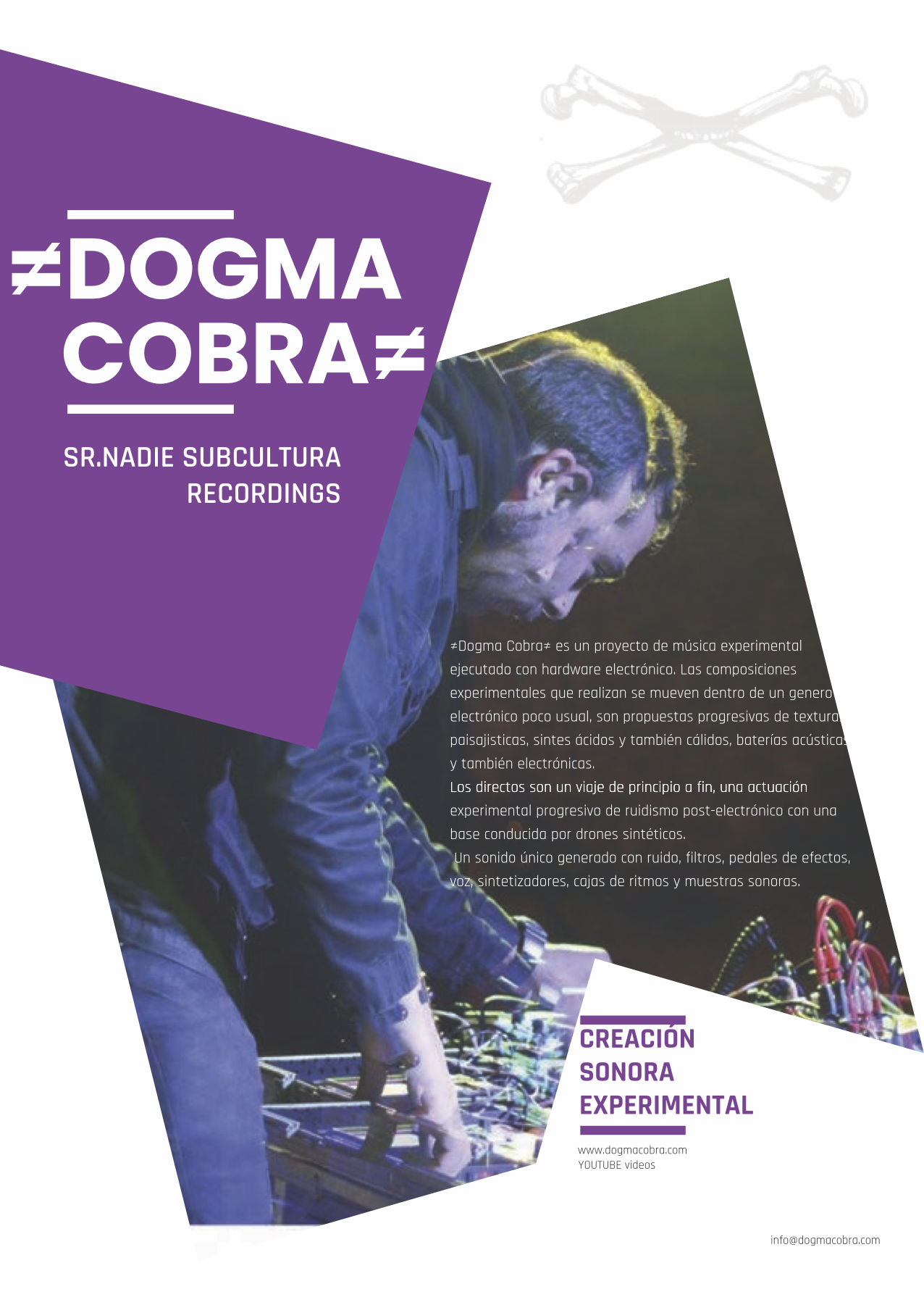 El primer protagonista de esta serie es “Dogma Cobra”, proyecto en solitario de Juan Carlos Cembreros, miembro de la banda de Electronic_Brutal_Noise_Acid_Drone_Experimental de Madrid : TurboInferno.